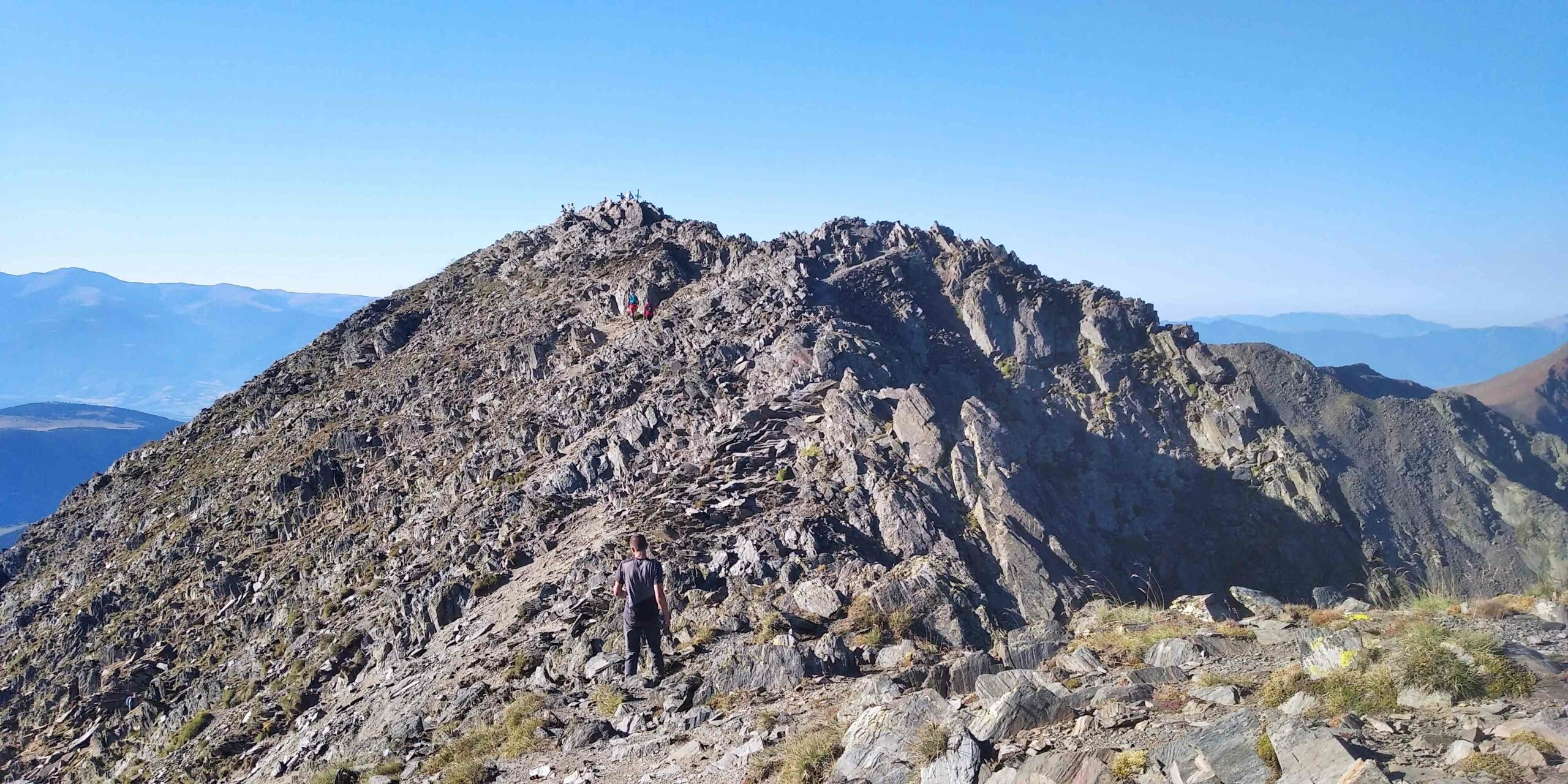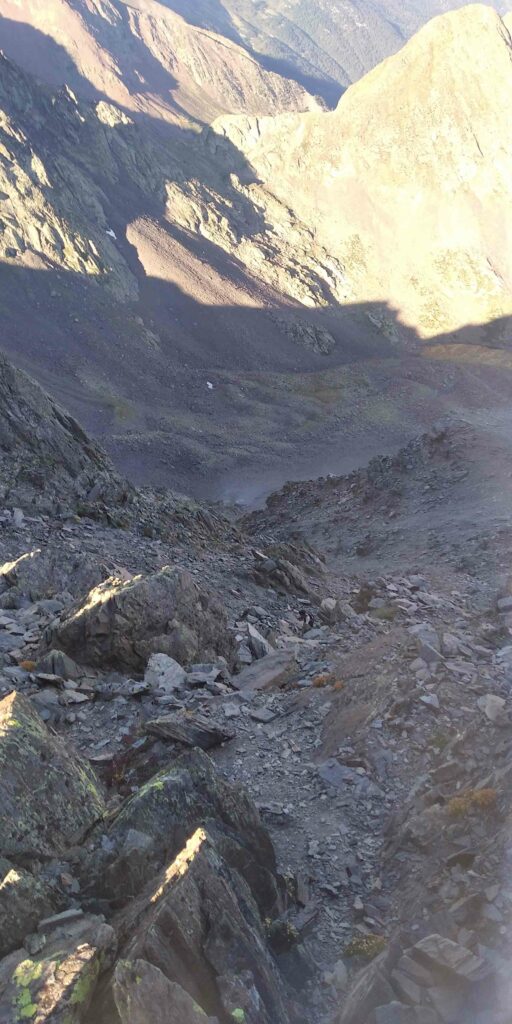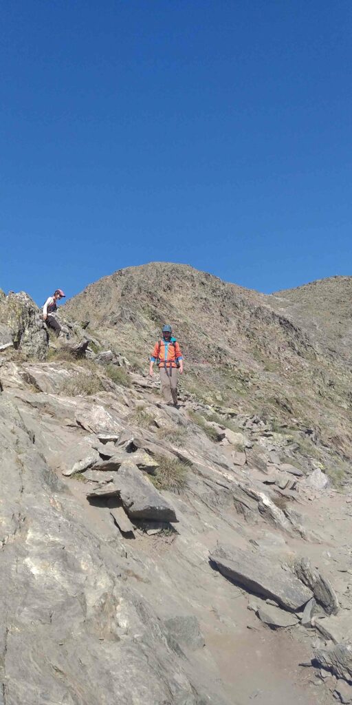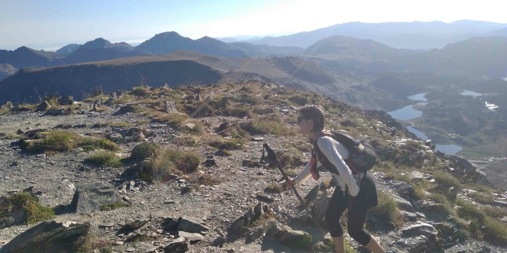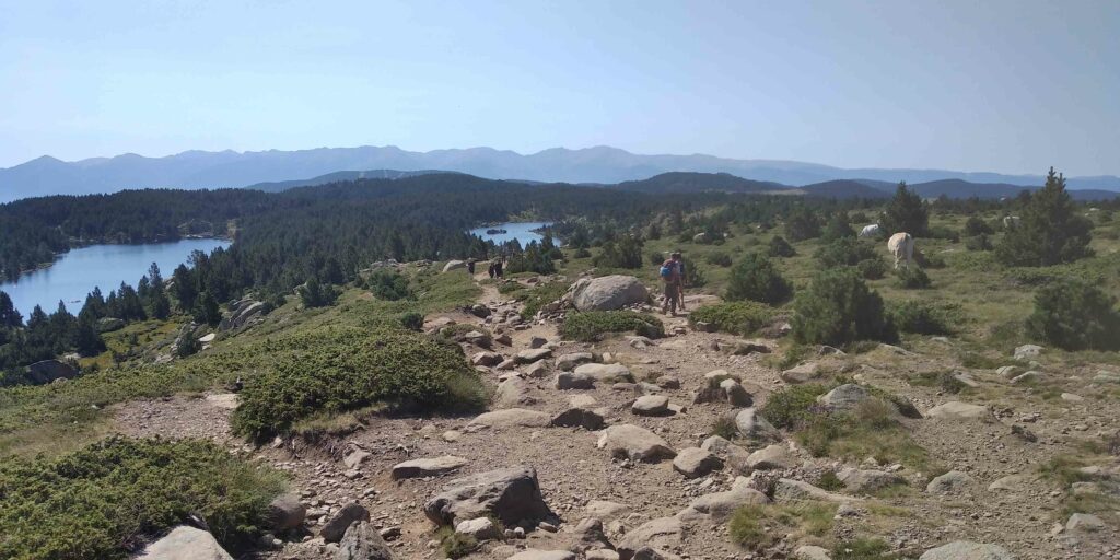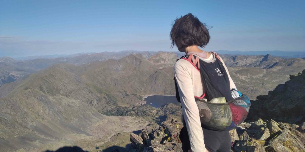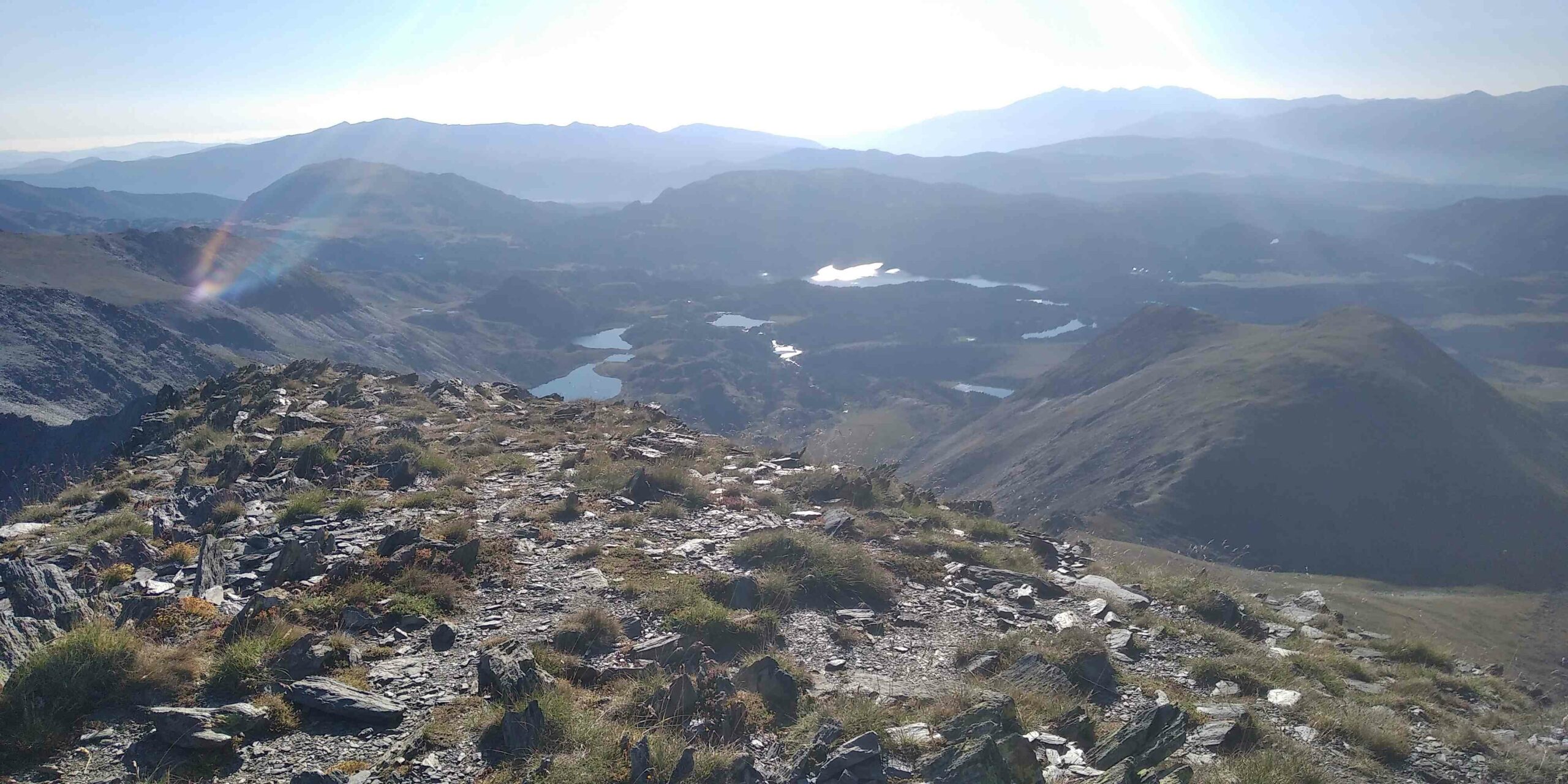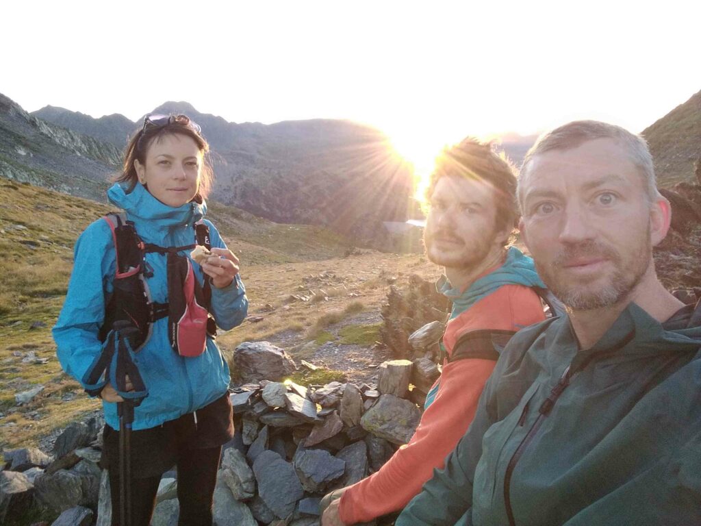 On part de bonne heure, on a les crocs ! Après avoir viré les chevaux du chemin à la frontale, on longe le relief sur un sol caillouteux d’ardoise et arrivons sur un replat traversé de cours d’eau. On monte au Portella de Lanos d’où on admire le lever du soleil. Devant nous, le Pic Carlit nous attend. Dernier sommet, dernière ascension avant la descente. Nos mollets frémissent d’impatience ! On approche par l’étang de Lanoux, on croque nos premiers tapas de la journée et on se retrouve en bas de la face Ouest. C’est un pierrier de petites pierres, très raide et glissant. Les traces laissées par les marcheurs et les traileurs sont multiples. Évidemment, on fait la course, une dernière fois. Quentin part comme un bourrin, je le suis. Olivier, dont un bâton est cassé, lâche au bout de quelques mètres. En peu de temps, on se retrouve là-haut, 2921 m avec une vue à 360 degrés sur les Pyrénées. D’un côté la série de lacs avec le grand lac des Bouillouses où se reflète le soleil. Le Canigou en fond, qui aurait pu être une fin de voyage pour nous, mais, contraint par le calendrier, on se le réserve pour plus tard. On peut voir les Pyrénées Ariégeoises où il nous est difficile d’identifier la multitude de sommets.