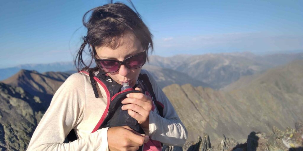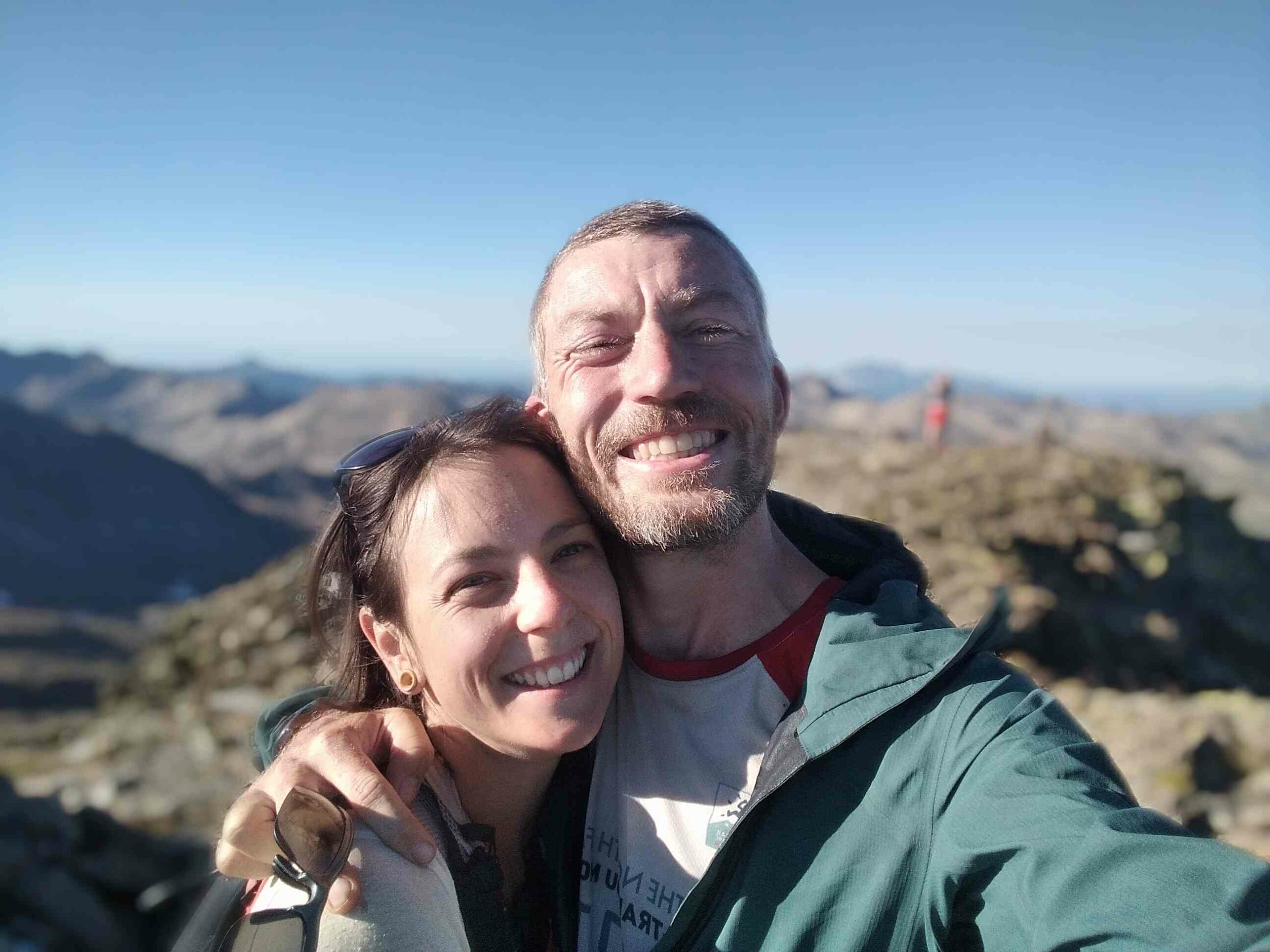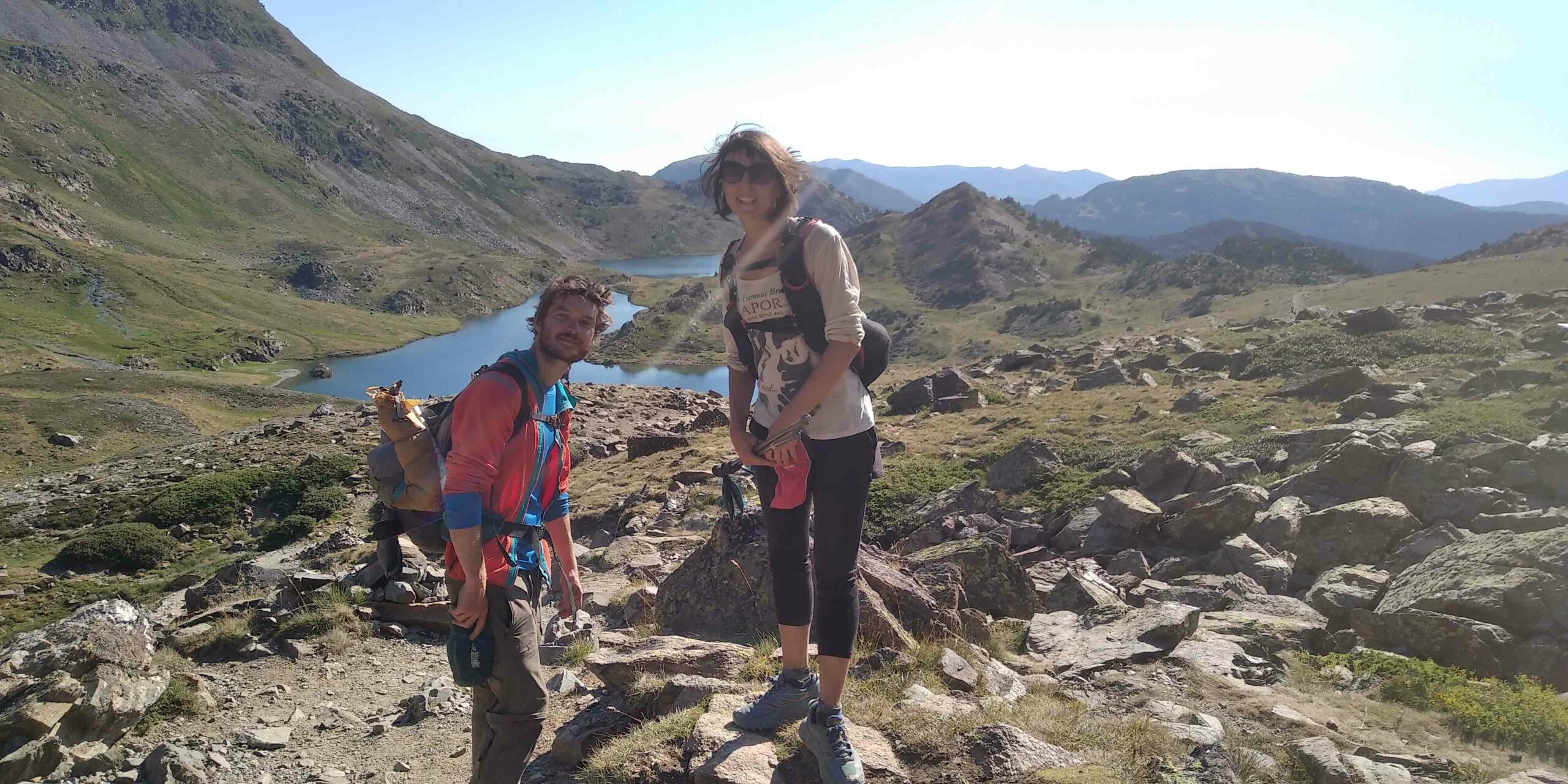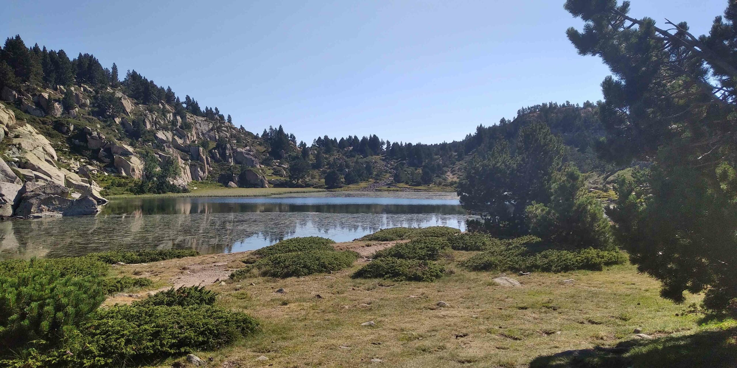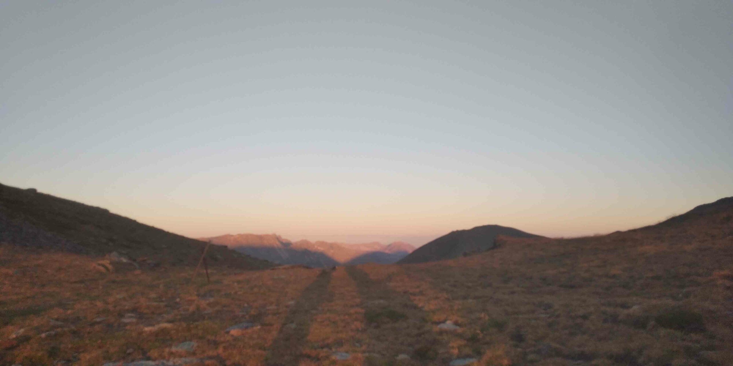 On part de bonne heure, on a les crocs ! Après avoir viré les chevaux du chemin à la frontale, on longe le relief sur un sol caillouteux d’ardoise et arrivons sur un replat traversé de cours d’eau. On monte au Portella de Lanos d’où on admire le lever du soleil. Devant nous, le Pic Carlit nous attend. Dernier sommet, dernière ascension avant la descente. Nos mollets frémissent d’impatience ! On approche par l’étang de Lanoux, on croque nos premiers tapas de la journée et on se retrouve en bas de la face Ouest. C’est un pierrier de petites pierres, très raide et glissant. Les traces laissées par les marcheurs et les traileurs sont multiples. Évidemment, on fait la course, une dernière fois. Quentin part comme un bourrin, je le suis. Olivier, dont un bâton est cassé, lâche au bout de quelques mètres. En peu de temps, on se retrouve là-haut, 2921 m avec une vue à 360 degrés sur les Pyrénées. D’un côté la série de lacs avec le grand lac des Bouillouses où se reflète le soleil. Le Canigou en fond, qui aurait pu être une fin de voyage pour nous, mais, contraint par le calendrier, on se le réserve pour plus tard. On peut voir les Pyrénées Ariégeoises où il nous est difficile d’identifier la multitude de sommets.