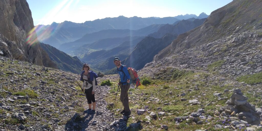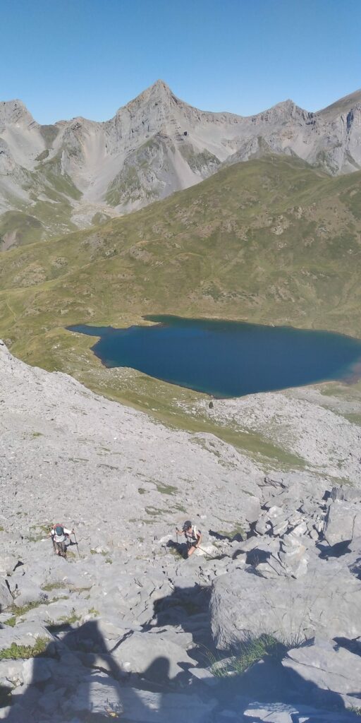 On se réveil avec un beau soleil, dans le frais de la montagne. On reprend notre ascension au milieu des iris des Pyrénées violettes jusqu’au col de Pétragème. Je me rends alors compte que j’ai perdu mes lunettes de soleil, erreur magistrale ! Laissant les deux lardons au col, et sans trop y croire, je rebrousse chemin en courant dans l’espoir de les retrouver. Quelle distance serai-je prête à parcourir avant d’abandonner ? Heureusement, elles sont là, au bord du chemin, pas si loin. Je les rejoins et, ensemble, nous entamons une descente raide qui longe les Aiguilles d’Ansabère, murailles verticales de calcaire impressionnantes, de toute évidence un délice pour l’escalade.