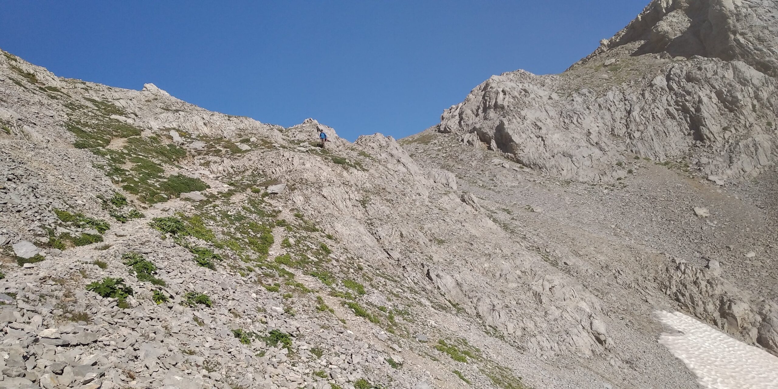 Après une traversée, nous repassons côté espagnol par le col de la Chourique. On arrive à un lac bordé de monde, le lac d’Acherito, surplombé par le pic de Laraille. On monte comme des sangliers jusqu’au col et je vais me faire le petit sommet Mallo de Las Foyas toute seule à 2126 m. S’en suit une longue traversée herbeuse dans la plaine de las Foyas jusqu’au col de Pau, col pour lequel Quentin fait une course qui ne motivera que lui !