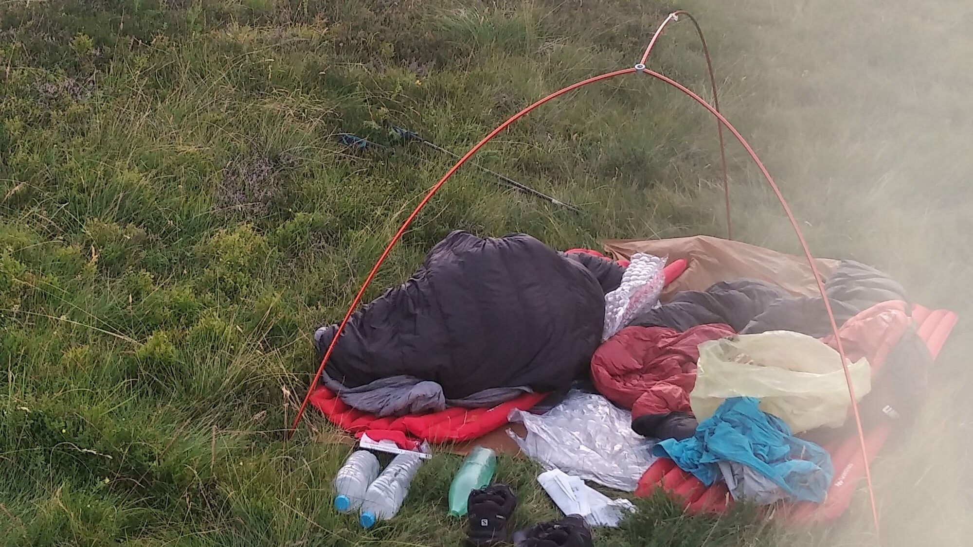 On repart et sur le chemin on voit des gars du PGHM qui refont le chemin. Quentin leur fait une blague qui tombe à l’eau ! On entame notre descente vers les Forges d’Abel. On croise du monde dans ce coin. On avait prévu de dormir au bord du petit lac d’Anglus en fond de vallée mais les voix nous font fuir. On traverse le gave d’Aspe et poussons encore sur la route du col du Somport, coupant les lacets comme des sangliers en sous-bois. Olivier se rachète des lunettes de soleil à l’auberge Aysa qui se fait de l’argent de poche en revendant des lunettes oubliées. Pendant ce temps, je fais ma toilette dans une source qui jailli à plein débit et que Quentin prend une boisson en terrasse. Nous montons dans le pentu pour trouver un bivouac. Les deux frangins se satisfont d’un plat de buissons agressifs dans lesquels on s’enfonce jusqu’aux genoux. Pour ma part, inquiète de crever mon matelas au jour 2, je vais explorer les alentours. Je dégotte un bon plat herbeux bordé de myrtilles avec coucher de soleil à la clé, ils me rejoignent. Pour nos premières myrtilles à déguster, méfiants, ils me laissent gouter avant pour être surs de ne pas s’empoisonner.