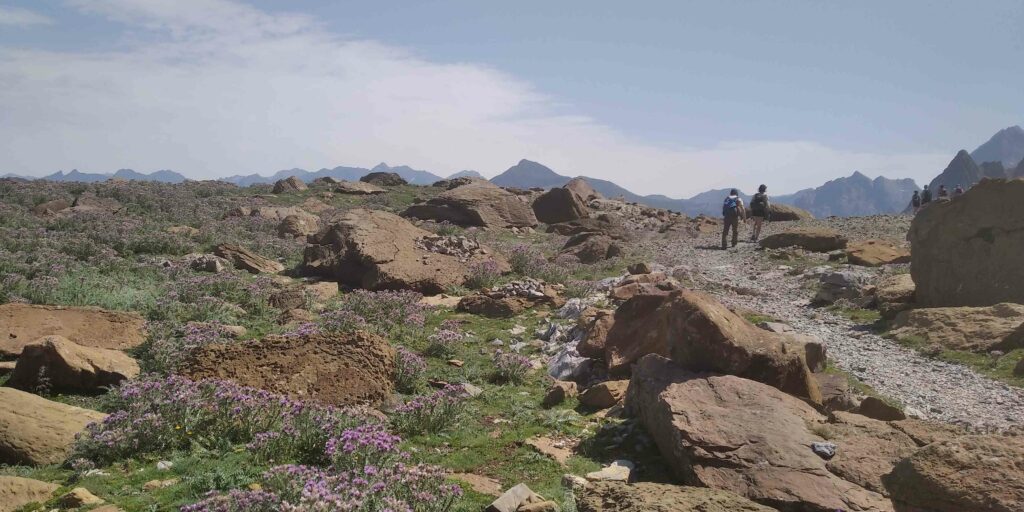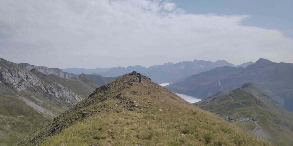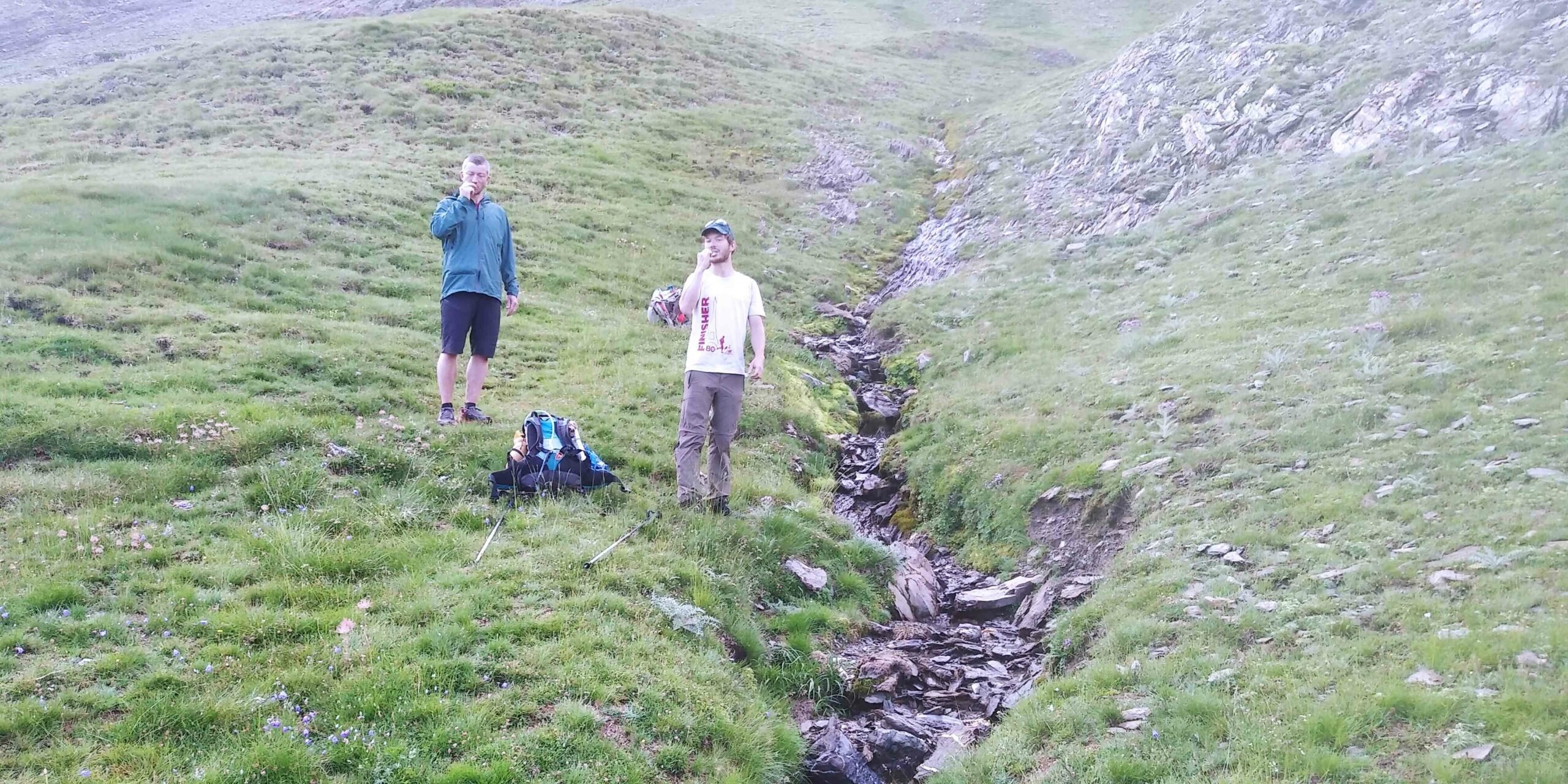 À peine la journée commencée, on est en manque d’eau. On sillonne entre les herbes hautes et les vaches qui nous sont de moins en moins sympathiques car, en plus de défoncer les sentiers, elles rendent les cours d’eau imbuvables. Nous ne suivons pas de sentier et ça nous épuise mentalement. On monte une pente herbeuse en mode sangliers. On finit par trouver un petit cours d’eau, bien en altitude. Doutant que les bovins soient venus s’y abreuver, nous marquons une petite pause brossage de dents, photo à l’appui, et remplissage des gourdes. Je gère la trace un moment. Sur une erreur d’aiguillage, je nous fais escalader une barre rocheuse de pierre friable, pas malin! Une fois sur le bon chemin, on se retrouve sur une magnifique crête, on suit des izards sur un sol caillouteux à flan d’une pente bien raide qui nous vaut parfois de poser les mains pour se sécuriser. Passant par le pic de Saint-André, on voit dans la continuité le pic de Gabiet dans son cirque de petits sommets. On bascule ensuite pour longer la frontière, passant par le Pic entre les Ports doté d’un énorme kerne, puis nous descendons au port de Boucharo. On perd Quentin de vue un moment, une pause petit coin collé discrètement.
