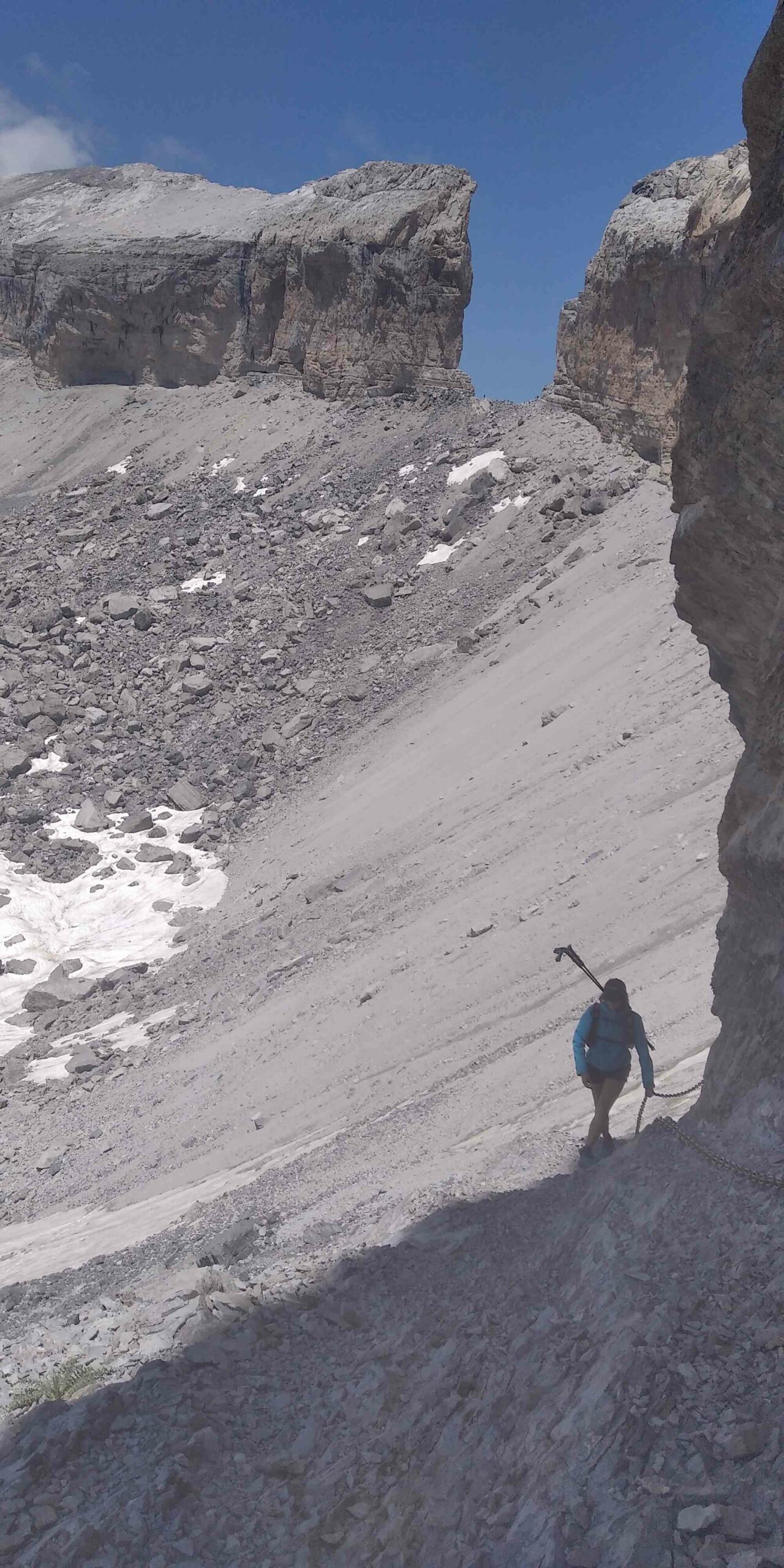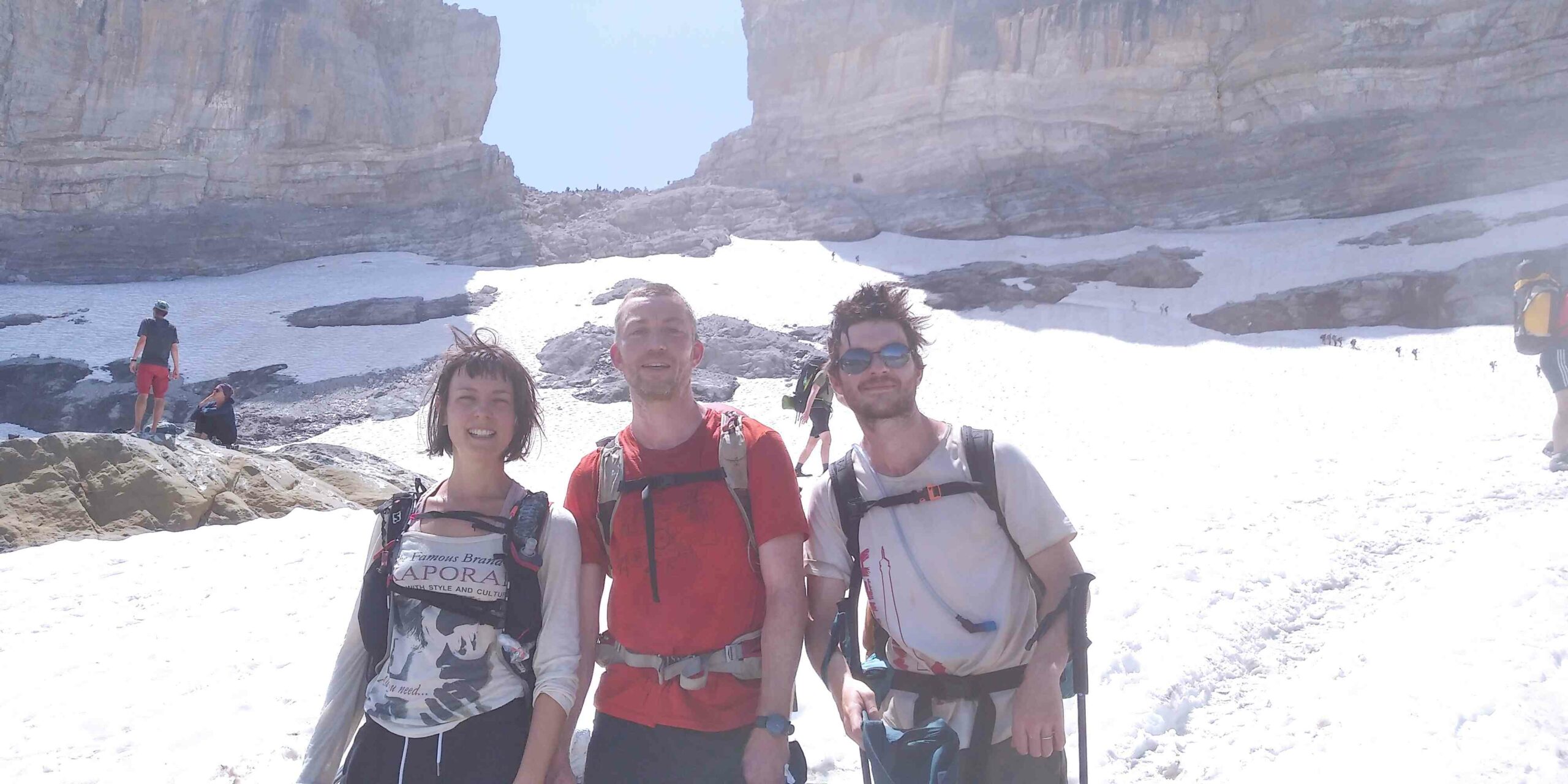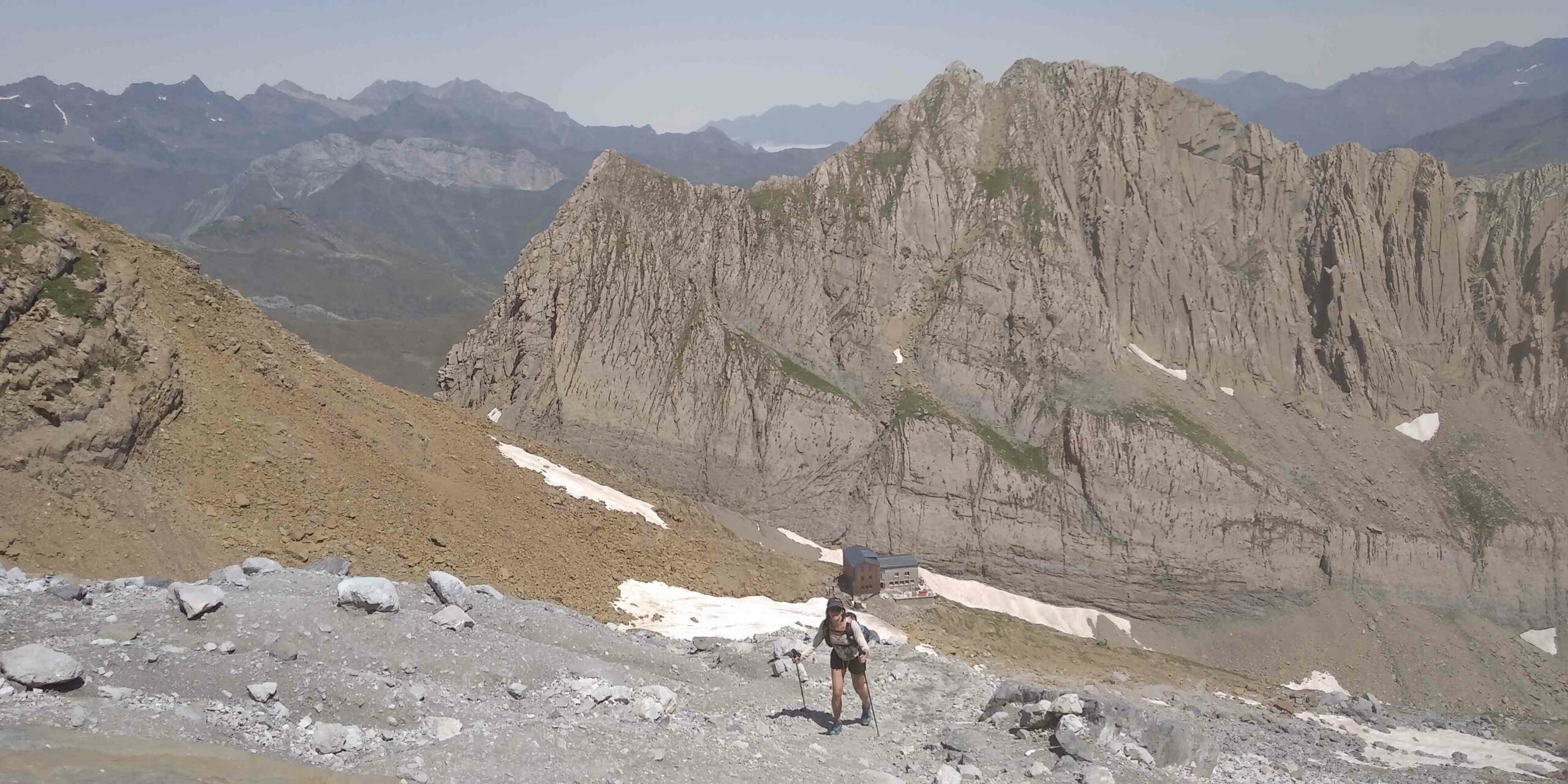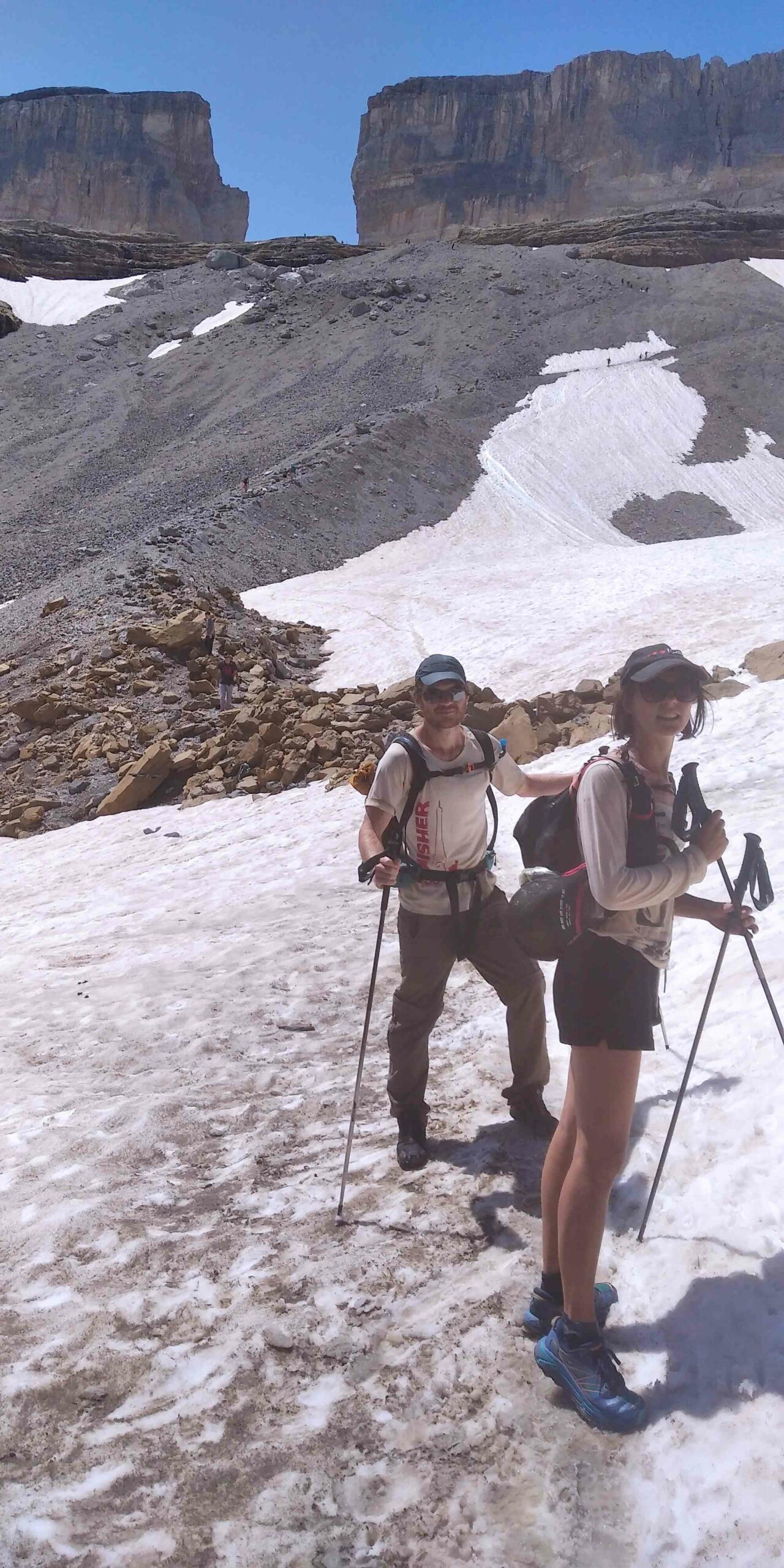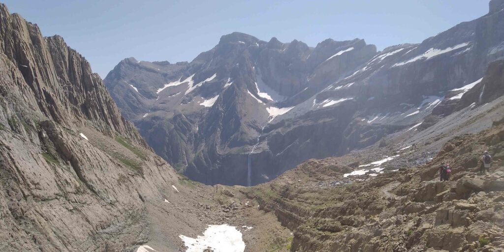 On se restore, on donne des nouvelles aux mamans et on repart, direction le cirque de Gavarnie ! Le chemin qui monte à la Brèche de Roland est magnifique. D’abord en douce montée, on évolue sur un sol oranger bordé de rochers. Ça va sans dire qu’on gobe de la tapas à volonté. On traverse le ruisseau du Taillon, doublant la queue de randonneurs de toutes nationalités. Le ruisseau est bien alimenté par le glacier du Taillon, on met les pieds dedans sans réfléchir, grosse erreur ! Mais qui fait du bien sur le coup avec le soleil qui tape. Les pieds trempés, on passe le col des Sarradets d’où l’on voit la grande cascade supplantée par le pic de la Cascade. À sa droite, l’Épaule et la Tour. À sa gauche, le pic du Marbauré et le petit Astazou qui ferme le cirque. Nous passons devant le refuge et montons sur le glacier de la Brèche qui résiste à la chaleur, bien installé sur sa face Nord. On atteint l’immense porte rocheuse, imposante brèche dans la montagne. Le vent nous rafraîchi, on avale une barre, admirant la vue de chaque côté de la brèche et on continue.