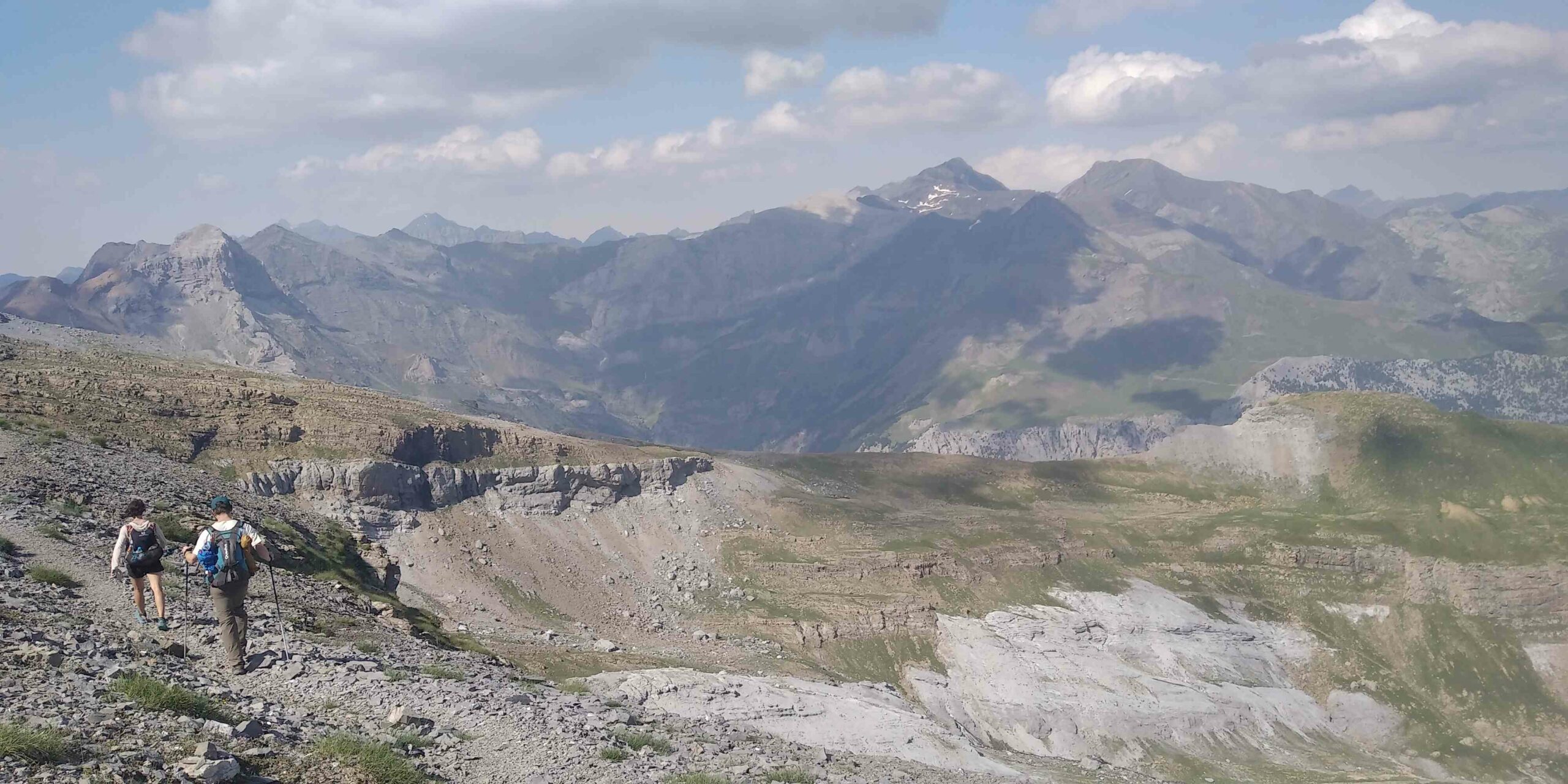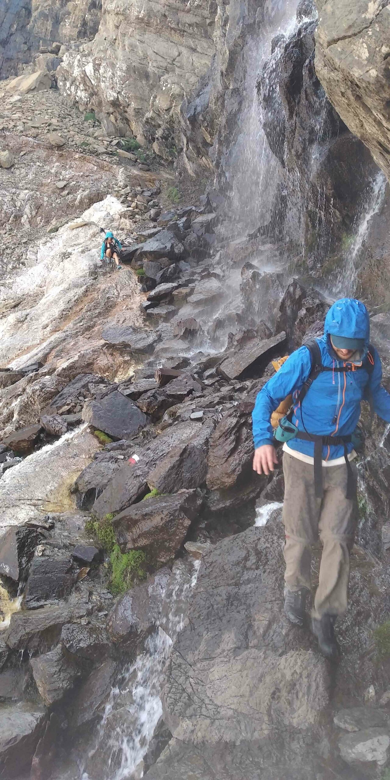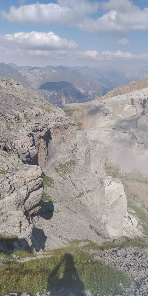 On longe le Monte Perdido sans jamais le voir. On arrive au refuge de Goriz, gros cluster de marcheurs. On fait le plein d’eau et on repart sans trainer. En contrebas, on voit le ruisseau de Arazas qui sillonne au fond d’une vallée encaissée dont on voit les méandres. On emprunte alors le GR 11, une variante tout du moins. S’en suit un chemin au milieu des blocs rocheux. On traverse une cascade qui coule du glacier du Perdido, protégés par nos imperméables. Nos pieds commencent à être douloureux. Après le bain de la cascade du Taillon, ils sont fripés comme des vieilles pommes flétries et les plis ont frotté entre eux pour former des ampoules, miam !